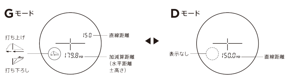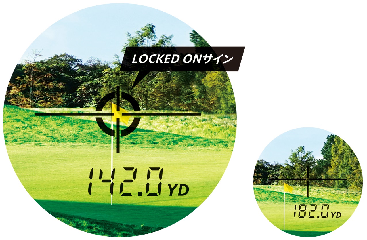 ■主な特長 ●高い測距性能。最大測定距離と測定結果の表示速度がさらに向上 最大測定距離の延長により、8~1600yd.(7.5~1460m)までの直線距離が測定可能に。その高い測距能力により、ピンフラッグなどの小さなターゲットも測定可能です。またHYPERREAD搭載により、目標物までの距離に関わらず一定して速いレスポンスで測定結果を表示することが可能です。本製品は約0.3秒で測定結果を表示します。 ※気象条件や目標物の種類によって、測定可能距離が変わることがあります。 ●ピンフラッグを測定できたことが一目でわかる「LOCKED ON」機能を搭載 メーカー最上位機種に搭載されたLOCKED ON機能を搭載。測定した距離が“ピンフラッグ”か“奥の林”か分かりにくいシーンでも、LOCKED ON機能があれば安心。ピンフラッグの距離を測定するとサークルが点灯する為、ピンフラッグを測定できたことが一目で分かります。 LOCKED ONサインは黒になります。 ピンフラッグ測定時(画像左) 手前にあるピンフラッグの距離を優先表示すると、LOCKED ONサインが点灯してお知らせ。 奥の林を測定時(画像右) 奥の林が測定された場合には、LOCKED ONサインは点灯しません。 ![]() ●ワンプッシュで簡単に測定モードの切替が可能 競技で使える「Dモード(直線距離のみを表示)」と、ID Technologyを搭載し起伏のあるコースで高低差をふまえ打つべき距離の目安も表示する「Gモード(直線距離に加え、水平距離±高さである加減算距離を表示)」の2つの測定モードを搭載。MODEボタンをワンプッシュするだけで、2つのモードを簡単に切り替え可能です。 「Gモード」 距離感のつかみにくい打ち上げや打ち下しのショットでのクラブ選択をサポートします。 「Dモード」 設定中は、直線モードサイン(緑色のLEDが点滅)で傾斜計の不使用をお知らせします。傾斜計機能を使用していないことが外観から分かる為、競技にも安心してご使用頂けます。(競技で使用する際には、事前に各大会のローカルルールをご確認ください) ![]() ●外観サイズがコンパクトに。より持ち運びやすく 外観サイズが従来機よりコンパクトになり、持ち運びやすさが向上。 ![]() ●雨天時も安心な生活防水構造 JIS/IEC保護等級4(IPX4)相当(メーカーの試験条件による)の生活防水構造により、雨に濡れても内部に水が浸入することを防ぎます。 雨滴により、目標物までの距離が正常に測れないことがあります。 ●近くの目標物の距離を優先的に表示する「近距離優先アルゴリズム」を搭載 「近距離優先アルゴリズム」を搭載することで、レーザーが複数の目標物に当たった場合、最も近い距離を表示させます。アプローチショットでピンフラッグを狙う際に、手前にあるピンフラッグまでの距離測定が容易です。 ●「連続測定」と「単発測定」 2種類の測定機能を搭載 ボタンを押し続けると最大約8秒間の連続測距が可能です。ゴルフでグリーン上のピンフラッグを測定するときは、連続測定でピンフラッグをターゲットマークの中心に狙い続けると、手ブレの影響を軽減することができます。 ●明るい6倍のファインダーと見やすいロングアイレリーフ設計 多層膜コーティングを施した6倍のファインダーにより、明るくクリアな視界を実現しています。また、大きな接眼レンズ径によりのぞきやすく、ロングアイレリーフ設計のため、眼鏡を掛けたままでも見やすく広い視界が得られます。 ■仕様
