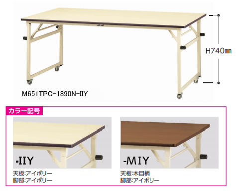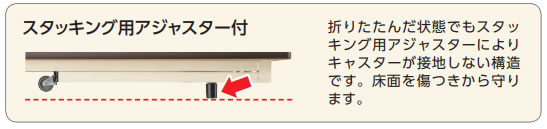 | ■特長 ●キャスター付きですので設置してからの移動も簡単です。 ●使わないときは折りたたんで狭いスペースに収納できます。 ●折りたたんだ状態で積み上げてもキャスターの出っぱりで床や天板を傷つけない構造です。 ![]() ![]() ■タイプ ![]() ![]() ■寸法図 ![]() ![]() ■品番の見方 ![]() ■仕様 ●ポリエステル天板(20mm) ![]()