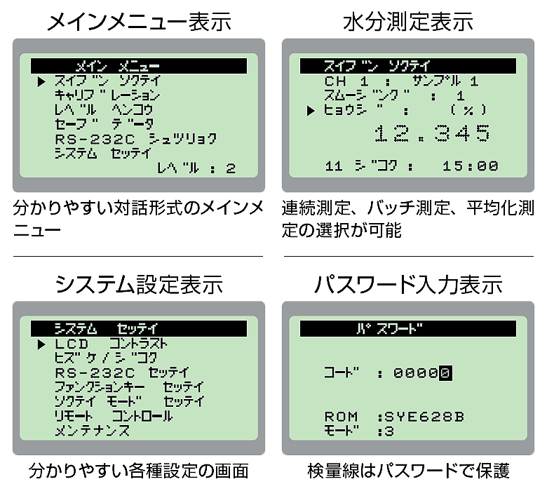 | 持ち運び可能なハンディ型近赤外水分計 非破壊非接触の水分測定 充電池による稼働 本体キー操作でデータロギング/検量線作成 ※実際の測定対象物を使用して検量線(測定対象物の水分率と近赤外線の吸収の相関)の作成が必要になります。そのため、対象物ごとに「検量線」の作成が必要になります。 ![]() ■特長 ●短時間・高精度測定 最大特長の短時間測定の応答時間はわずか2秒、多数の試料も手際よく処理することができます。 また、再現性に優れ高精度の水分測定が可能です。 ●非破壊・非接触 加熱・発熱などをほとんど伴なわず、試料に物理的・化学的変化を起こさせません。 貴重な試料でも安心して測定ができます。 ●検量線の自動作成機能 測定に際し、あらかじめ各試料の検量線を作成する必要がありますが、本器は検量線自動作成機能を装備しています。 ●50種の検量線を記憶 作成した検量線を50種、記憶させることができます。試料を直ちに測定することができるので、多種多様な試料をすばやく測定しなければならない品質管理・検査部門などに最適です。 ■画面表示 ![]() ■仕様