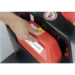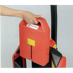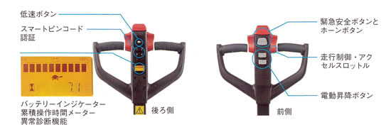 | ■快適な操作を可能にしたスマートハンドル 人間工学に基づいたハンドル設計、グリップ部は長時間の作業を考慮したソフトで使い心地のよいデザイン。 ハンドルボタンは大きめに設計に設計さており、手が届く位置にあるので手袋を着用したい手も簡単に操作できます。 液晶ディスプレイ付きピンコードパネルは高度な制御と操作を可能にします。 ■ハンドル ![]() ![]() ■スマートリチウムバッテリー メンテナンスフリーリチウムバッテリーを装備。 充電器は急速充電機能があり、バッテリーのみの充電も可能です。 そのため、従来の電動パレットトラックと違い、バッテリー管理・維持を手軽に行う事が出来ます。 また、バッテリー管理システムは本バッテリーのパラメーターとパフォーマンスを最適に制御します。 ![]() ●スマートバッテリーロックでバッテリーをしっかり安全に固定できます。 ![]() ●バッテリーを取り外さなくても充電を可能にする充電差込口(充電ポート)。 急速充電機能があり作業の合間に充電できるため、作業時間を増やせます。 ![]() ●緊急停止ボタン ![]() ●補助車輪 ![]() ■寸法図 ![]() ■共通仕様