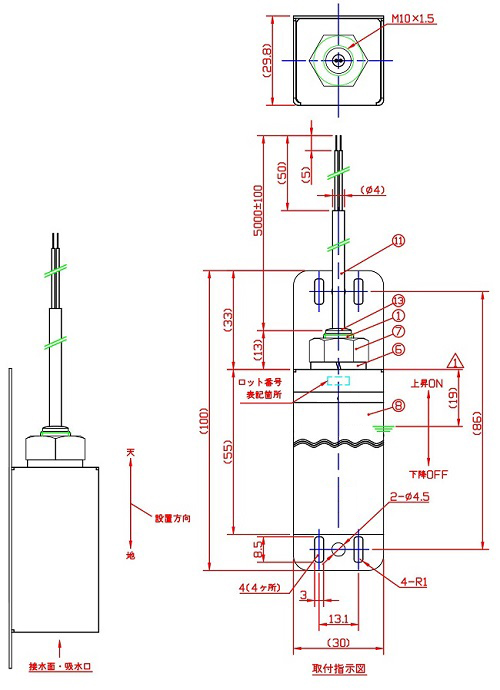 ●冠水センサーに最適 ●金属カバーにより、フロート摺動を保護 ●金属カバーで覆う事で外からのダメージを軽減 ●このセンサーは水没は不可です。 |