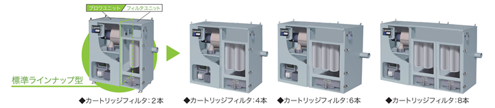 ブロワユニットとフィルタユニットが分割構造になっているため、お客様の使用状況に合わせてフィルタろ過面積の選択が可能です。