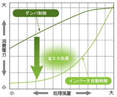 インバータによる制御なのでダンパ制御と比べ、消費電力を低減。CO2排出量を削減できます。