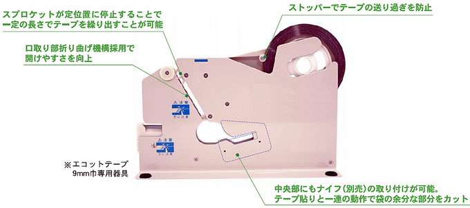 | 消費者に優しい 『簡単開封』 『再封可能』 なバックシーリングテープ9mm幅専用器具です。 従来より軽い力で作業ができるようになりました。(メーカー比) ![]() ■用途 パン、菓子、野菜、果実の袋の口止めに ![]() ![]() ■仕様