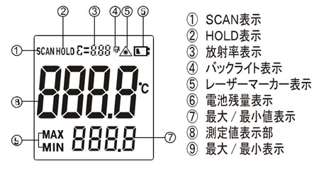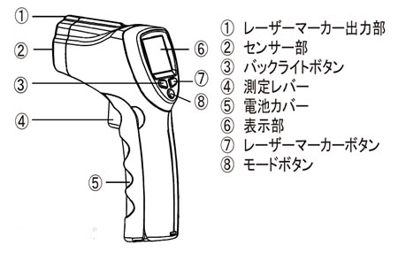 | ■特長 ●最高550℃まで測定可能。温度表示0.1℃単位。 ●測定対象に応じて放射率を設定可能。(0.10~1.00まで0.01づつ) ●測定レバーを引くだけの簡単操作。小型・コンパクトで作業性が良く、持ち運びも容易です。 ●測定位置の目安がわかるレーザーマーカー機能付き。 ●電池の消耗を抑えるオートパワーオフ機能搭載。 ■製品詳細 ![]() ■各部名称 ![]() ■画面表示例 ![]() ■測定可能範囲 ![]() ![]() ![]() ■仕様 ●電気的性能
