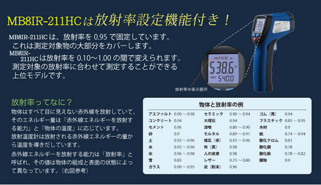 レーザーマーカー機能付き・放射率の変更が可能な表面温度測定用の温度計 | 放射温度計 (放射率変更機能付) 品番 MB8IR-211HC |