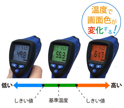 温度で画面色が切り替わる「温度差アラーム機能」つき! | 放射温度計(温度上下限越え画面色表示) 品番 MB8IR-250HC |