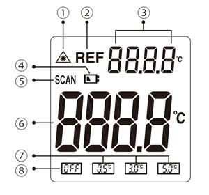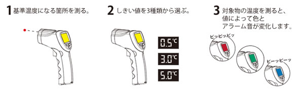 | ■特長 ●基準温度と測定温度を比較し、設定したしきい値により警告。 ●見やすいカラーバックライト付きLCD搭載。 ●小型・コンパクトで作業性が良く、持ち運びも容易。 ●測定レバーを引くだけの簡単操作。 ●測定位置の目安が分かりやすいレーザーマーカー機能付き。 ●測定物に応じて放射率を設定可能。 (0.10 ~ 1.00 (0.01づつ可変)) ●用途例:工場や各種作業現場等での表面温度測定に。 ●高圧トランスなどの近寄れない部分等の表面温度測定に。 ●モーター等の回転体の表面温度測定に。 ■製品詳細 ●温度で画面色が切り替わる「温度差アラーム機能」 ![]() ●温度差アラーム機能の使いかた ![]() ■各部名称