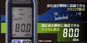 | ■特長 ●国際規格IEC 61672-1準拠。 ●測定の最大値または最小値を表示可能。 ●測定値が設定したアナログレンジを上回ると「OVER」、下回ると「UNDER」を表示するアラート機能を搭載。 ●測定対象に応じて時定数の切り替え(FAST/SLOW)が可能。 ●キャリブレーション機能つき。(A特性のみ。キャリブレータは別売。) ●AC/DC出力端子付き。(AC/DC 3.5mm標準型プラグ対応接続端子) ■製品詳細 ●A/C特性・FAST/SLOW切替に対応。 ![]() 人間の聴覚に近く、一般的な騒音測定に用いられる「A特性」、衝撃音など低い周波数成分の多い音圧レベルの測定に適した「C特性」の両方に対応。 また、人間の耳の応答時間に近い測定値が得られる「FAST」特性(時定数:125ms)と、変動する騒音の平均レベルの測定値得られる「SLOW」特性(時定数:1s)の切り替えが可能。 ●「アナログ表示」と「デジタル表示」の2種類に対応。 ![]() 変化量が瞬時に認識できる「アナログ表示」と測定値を瞬時に確認できる「デジタル表示」の2種類に対応。 ■各部名称