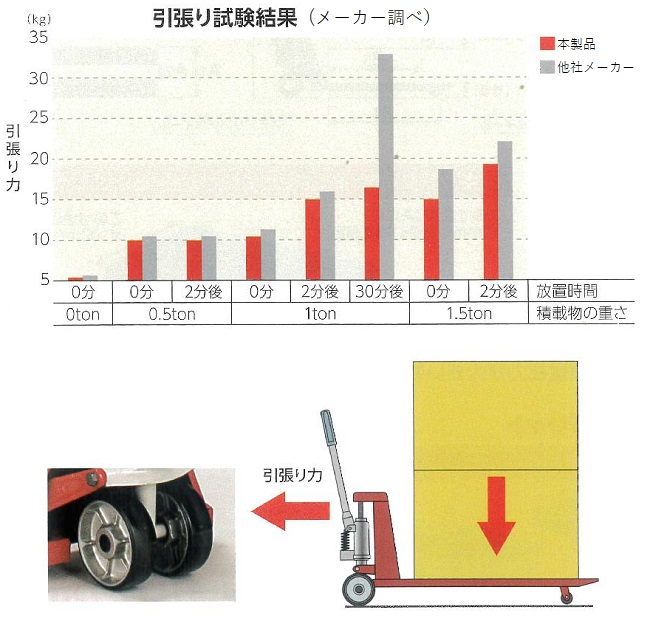 ![]() ■特長 ●とても頑丈で軽量 本体には高張力鋼板を使用般鋼材に比べ降伏点・引っ張り強さが優れています。鉄板の厚さを薄くすることで、本体重量の軽量化を実現しました。 ●ピストン式シリンダー 重要なシール部分にはUパッキンを使用していますので、油漏れによる自然降下の可能性は僅少です。 ![]() ●環境に配慮、さらに寒冷倉庫でも使用できます。 塗装には、無鉛塗料を使用し、環境に配慮しました。さらに寒冷地用オイルに変更することでー15Cの環境下でもご使用いただけます。 ●操作性が抜群です ハンドルの回転軸には、2つのスラストベアリングを使用し、ハンドルの舵取りの操作性を良くしています。メーカー独自のノウハウを活かし、メーカー独自開発したウレタン車輪を使用しました。ゴム車輪を使用したハンドパレットトラックは、荷物を載せたまま放置しますと、車輪が変形しその後動かし始めの引張り力が非常に大きくなります。 ![]() ■標準ステアリングホイール&フォークホイール ![]() ■寸法 ![]() ■仕様 ●フォーク高さ 最低高65mm~最高高165mm