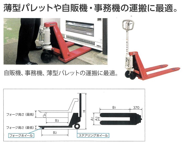 低床型。 薄型パレットや自販機、事務機の運搬に最適。 |