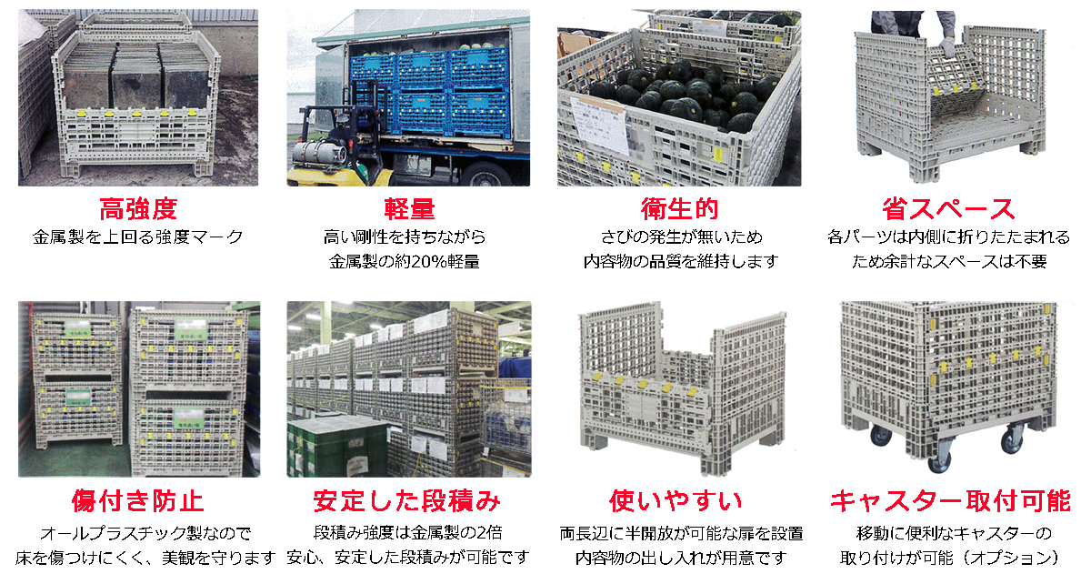 従来の金属製メッシュパレットを上回る多くの特長を備えています。