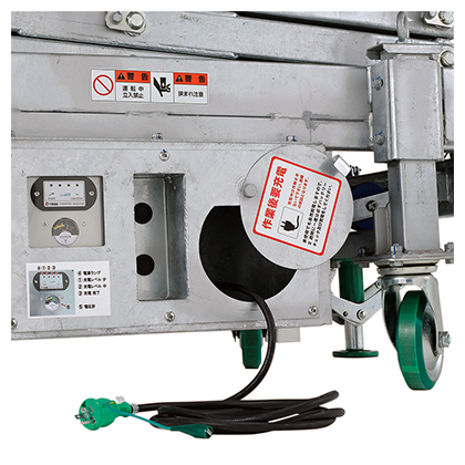 ![]() ※傾斜地及び地盤が軟弱な場所では使用しないで下さい。 ※始業前点検を確実に行ってください。(オイル漏れ・操作ボタン・充電状態確認・充電器コードの収納) ※荷又は工具は、偏荷重、集中荷重とならないように、作業床手摺からはみ出さないこと。 ※必ず人がいないか周囲を確認してから操作してください。 ※ペンダントスイッチの断続のON・OFFは故障しますのでやめてください。 ※ペンダントスイッチを引っ張らないでください。 ※バッテリーは自然放電しますので、未使用・保管時も約2週間に1度は必ずバッテリーチェック及び充電をしてください。 ※充電中の作動はしないでください。故障します。感電する恐れがあります。 ※長期使用いない場合はバッテリー保護の為、遮断器をOFFにしてください。 ※遮断器の連続ON、OFFは故障の原因となります。 ※取扱説明書をよくお読みの上ご使用ください。 |