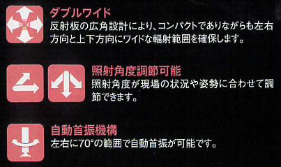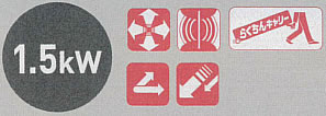遠赤外線で身体の芯から温めます。![]() ■赤外線は、身体が最も吸収しやすい波形 人体に最も吸収されやすいのは3~20ミクロンの波長の遠赤外線です。 遠赤外線から発生する熱エネルギーの90~95%が身体に吸収されるので、身体の芯からあたたまります ![]() ●身体の表面ではなく、芯からあたためる。 遠赤外線は身体に吸収されると、体内の水分や蛋白質、死亡などの分子と共鳴し、熱エネルギーを生む働きがあります。 つまり、身体の芯からあたたまるから、ぬくもりが持続 ![]() ■遠赤外線は波長がながいから直進性が強く、遠くまであたためます。 少し離れたところからでも、作業者をスポット暖房 ![]() ●風が吹き込む作業所や広い工場でも、作業者をダイレクト暖房 ![]() ●燃焼しないから空気を汚さない。 燃焼しないから安心してお使いいただけます。 空気を汚すことが無いので、換気の手間も省けます。 ※はじめて運転する時はセラミックヒーターから煙や油のにおいが発生する場合があります。 ご使用に伴い発生しなくなりますが、煙やニオイが発生した場合は、十分に換気してください。 ●まぶしく感じない ヒーター管の表面が赤く光るだけで、まぶしさを感じることなく作業の妨げになりません。 ●現場での使い勝手に配慮した安心・便利設計 ![]() ●セラミックコーティングヒーター ・衝撃に強い ヒーター管には、特殊金属の耐熱管にセラミックコーティングしたものを採用しているため、とっても丈夫 1.5kgの鉄球が1mの高さから直撃しても割れない強度で安心です。 ・水にも強い ヒーター管は急激な温度変化にも強いので、万一、水がかかったりして安心です。 ※ヒーター管のみ。本体は防水、防滴仕様ではありません。 ![]() ※ヒーター管について 運転中でも周囲が明るいと、ヒーターが赤く見えにくい場合があります。 ●便利/照射角度調節 現場の状況や作業者の姿勢に合わせて、水平からの上向き25°の範囲で照射角度が調節できます。 ![]() ●便利/ダブルワイド輻射 反射板の広角設計により、コンパクトでありながらも左右方向と上下方向にワイドな輻射範囲を確保します。 ![]() ●安心/転倒OFFスイッチ 転倒したら自動でOFF 作業場の安全を守ります。 ![]() ●丈夫/電源コード うっかり足で踏んでもつぶれない、丈夫なキャブタイヤコードを採用しています。 ●保護ガード ヒーター管に人の手や物が触れないよう、ボディ正面に保護ガードを採用。 工具なしで取り外せるからお手入れも簡単です。 ●楽ちんキャリー スタンドの後ろ側にキャスター、ボディ背面に大きな取っ手がついているから、作業ラインが変わっても、持ち運びラクラク。 傾けるだけで持ち上げずに運べます。 ![]() ■天井吊ライン形の配線について (MD35RHK-15JVH) ![]() ![]() ![]() ■タイプ
