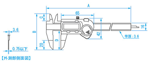 | ■特長 ●ジョウの先端部分は0.75mmの薄型ジョウ ![]() ●別売のBluetoothBOXに対応 ●ホールド機能、オートオフ機能付(約20分) ■用途 ●外側・内側・段差・深さ測定 ![]() ■寸法図 ![]() ■仕様