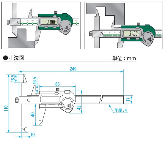 | ■特長 ●ジョウを上下にスライドさせ、固定することができます。 ●別売のBluetoothBOXに対応 ●ホールド機能付 ●オートオフ機能付(約20分) ■用途 ●段差のある箇所での外側・内側測定 ![]() ■仕様