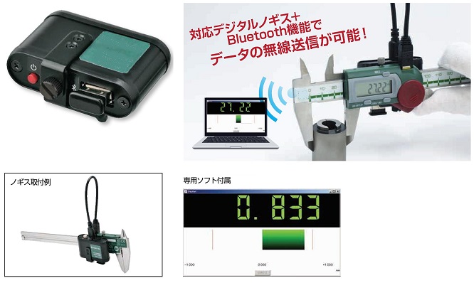 ※2:CR2032(リチウム電池)テスト用1個付属 ■オプション ●測定値のワイヤレスデータ転送に! ●Bluetooth ドングルを別途用意する方式で、国を選ばずに使用できます。 ●Bluetooth機能搭載パソコン・タブレットと接続し、無線データ通信が可能 ※Bluetooth機能が無い機器でも、市販のBluetooth用USBドングルを購入頂ければ、データ通信可能です。 ●付属ソフトでExcelなどへの測定値出力、合否判定が可能 ![]() ■用途 ●対応ノギスに取り付けて、測定値をパソコンへワイヤレス送信することが可能です。 ■仕様