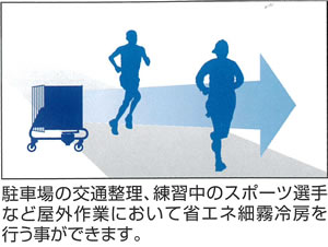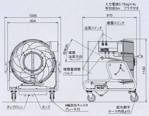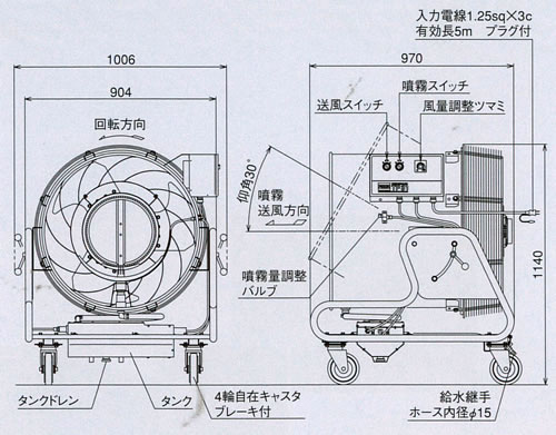 屋外仕様の細霧発生送風機 ノズルがないからメンテもラクラク ※防水仕様ではありません。 |