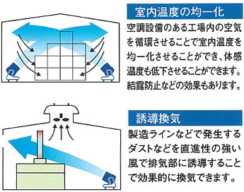 | ■特長 ●一般的な工業用扇風機と変わらない300Wという電力で風速1mの風を47m先まで送れます。 ●専用のインバータを標準搭載しているので、40Wから運転が可能です。(但し風の到達距離は変動) ●効果範囲の可能性を広げる抑角90度設置を実現 ●ファンの近くで作業ができる低騒音(最大66dB)を実現 ●前部安全ガードを標準装備 ●従来の三相200V仕様に、クラス初の単相100V仕様をラインナップ ■仰角90度の送風が可能 ![]() ■評価&効果 ![]() ![]() ■用途 ![]() ![]() ![]() ■仕様