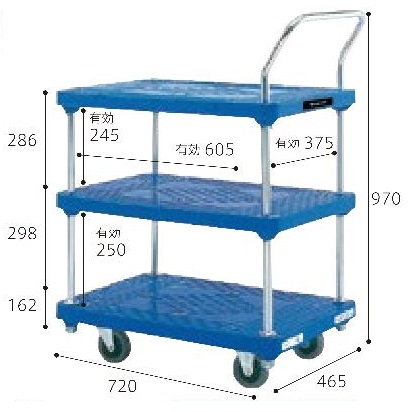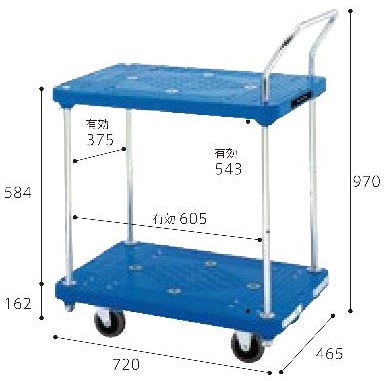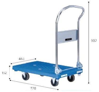 メーカー独自のリブ配置やハンドルをしっかり支える設計になっており、しっかりと荷物を支えるプラスチック製台車 軽量化、耐衝撃性、耐腐食性、耐久性のある一体成型 最大重量:150kg 積載面:465×720mm |