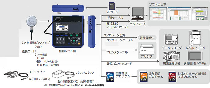 | ■従来品(MI11M-53/MI11M-53A)からのアップ機能 ●振動レベル(Lv)、振動加速度レベル(Lva)同時測定 ●大容量SDカード対応最大32GB (測定データはCSV出力。エクセルなどの表計算ソフトで扱えます) ●オプションプログラムによる追加機能 長時間の連続データ自動記録、コンパレータ出力機能、3方向同時1/3オクターブバンド実時間分析、3方向同時波形収録 ●コンピュータとの通信USB端子・I/O端子 ●USBストレージ対応 (リムーバブルディスクとして認識) ●単三形アルカリ乾電池・ニッケル水素充電池で27時間測定 ●防塵防水性能IP54(本体) ■システム構成図 ![]() ■仕様