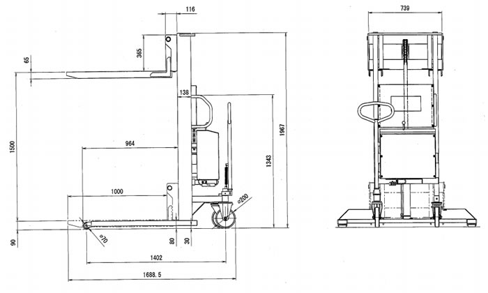 | ●レバー操作で上昇・下降は、ワンタッチです。昇降スピードはレバーを倒す角度に応じた可変式です。 ●各種工場、物流センター、倉庫などの運搬昇降(高ストローク)台車として。 ■仕様 ●手動走行式 ●昇降方式:バッテリー油圧式(タービン油:ISO-VG32使用) ●電源:単相100V(コード長2.5m) ●充電時間:約7時間 ●前車輪:固定ウレタンキャスター2個 ●後車輪:自在ウレタンキャスター、自在ストッパー付ウレタンキャスター各1個