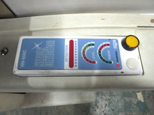 | ■特長 ●検針精度の向上 新開発の検針センサー採用により、検針精度が更に高まりました。 検出高100mmで鉄球φ0.8mmを検出 検出高140mmで鉄球φ1.0mmを検出 検出高180mmで鉄球φ1.2mmを検出 従来φ1.0mmを検出するには、検出高は100mmが限界でしたが、HN-650Cは業界初の検出高140mmを実現しました。 ●外部ノイズに対する性能の向上 新型センサーヘッドは外部ノイズに対しても優れた性能を持ち合わせ、従来機と比較した場合、外部ノイズによる影響 を30%軽減しました。 ●検出感度の安定性 検出エリア内での検出感度の均一性を図り、安定性に対する性能において従来機比30%upを実現しました。 付属品に対しても、今まで以上に安定した反応が得られます。 ●新感度レベルモニター 感度レベルモニターは新デザインを採用し、モニターレベルの視認性の向上を図りました。 検出位置ランプは10分割されており折れ針等の位置を正確に表示します。 ●リターン機能 折れ針、マチ針を検出するとブザーがなりコンベアーが自動停止して商品を手元まで戻します。 ●ベルトスピード 40m/分(50/60Hz) 処理能力の高さに直結するベルトスピードはクラス最高です。 ■操作パネル
