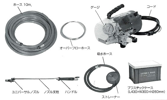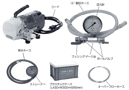 | いつでもどこでも手軽に使える100Vタイプ無給油・ポンプ 「電気ポンプ」の適合性検査合格商品です。 ●製品性能が違います ●組立、分離修理が簡単にできます。 ●世界各国に輸出され大量生産により、底廃、良品質です。 ![]() ●全くオイル(潤滑油、グリス)の要らない無注油ポンプのため保守点検から解放されます。 ●総ての無駄を省いた未来の高圧ポンプです。 ●差動ポンプですから1連でも2連の役割を果し脈動が非常に少ない。 ●モーター軸兼用ポンプのため、ベルトのスリップの心配はありません。 ●コロガリ摩擦を最高度に利用した設計<実用新案、意匠登録>で起動時の少く、出力は絶大です。 ●和風建築の敷居とふすまの摩擦に対して本ポンプはアルミサッシのころがりに匹敵した軽快さで回転します。 ●小型超軽量のため持ち運び、移動に便利です。 ●オールポジションポンプですから誰でも分解掃除、組立ができます。 ●ユニバーサルノズルの開発によりあらゆる作業がワンタッチで出来るようになりました。 ■用途 ●空調機器の洗浄 ●字土砂エンジンルームの洗浄 ●左官の洗い出しに ●食品工場機器の洗浄 ●農業機器の自家洗浄 ●園芸・樹木の消毒に ●印刷機器の洗浄 ●水道配管のテストに ●ガス配管のテストに ●バルブ容器の耐圧テストに ●破かいテスト用として ●学校教材用として ■タイプ/標準付属品