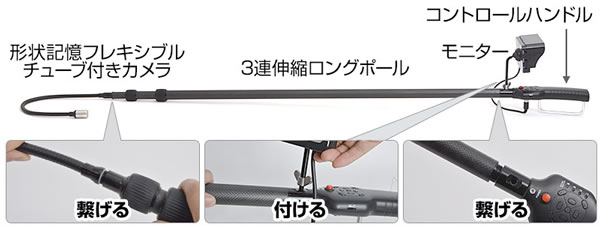 「3連伸縮ロングポール」の先端に「形状記憶チューブ付きカメラ」が搭載。