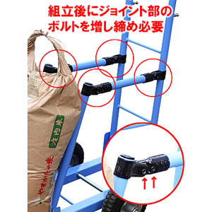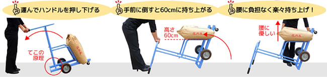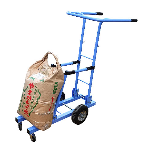 | 倉庫の中でもスイスイ移動。腰の高さから持ち上げられる体にやさしい運搬台車です。 積載重量30kg(1袋) まで。 ※安全のため砂地など未舗装床面でのご使用はご遠慮ください。 ●アイデア次第でいろいろ運べます。 ●土嚢の運搬、肥料や堆肥袋など、重量のある袋の運搬。 ●運搬後は持ちやすい高さに上げられるので、腰を痛める心配が少なくなります。 ●年間生産台数が限られていますので、今年度分は在庫限りとなります。 ![]() ![]() 米農家さんなら1台あると重宝します。 電動リフトなど便利な機械もあるけれど、急なバッテリー切れで困った時、ちょっと運びたい時にサッと出せる軽さが最高。 動力なしで狭い通路や倉庫の中もスイスイ歩ける。 気づいてみたら一番使ってるかも知れません。 引き倒せば腰の位置から持ち上げられるので、繰り返しの積上げ作業も楽になります。 ハンドルを外して折り畳みができるようになりましたので、普通車での持ち運びや収納保管も可能になりました。 ![]() ■使用者さんの声 ●何十袋も積むので腰の高さから持てるのはすごく助かった! ●電動リフターがバッテリー切れの時に重宝した! ●計量器からすぐに移動できて仕事が早かった! ■折りたたみ可能 ![]() ![]() ■計量➡運ぶ➡積む 動力不要でノンストップ作業を実現 ![]() ■仕様
