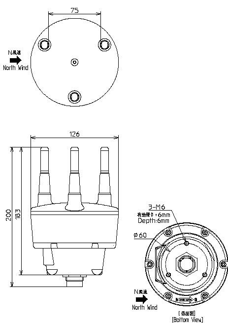 | 気象庁AMeDAS対応品 微風から超強風90m/sまでの観測可能 ![]() ■観測目的 ●大気拡散観測に、風況観測に ●低層気象及び局地気象観測に ●環境・防災分野の自動気象観測に ●交通機関の安全管理用に ■特徴 ●90m/sの風速レンジを持つ超音波式風向風速計です ●ヒーター内蔵型も選択可能で降雪地域にも最適です ●微風から強風域までハイレスポンスでリニアリティの高い測定が可能です ●可動部が無く強風時においても破損の恐れが少なく耐候性に優れています ■外形図 ![]() ■仕様