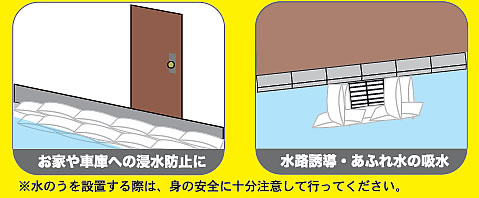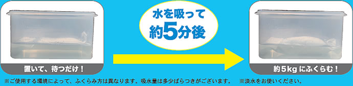 | 早い、軽い、浸水対策。 重い土は不要。 水だけでふくらむ水のう、吸水ポリマー使用 たったの5分でふくらむ水のう。使用後は一般ゴミとして処理可 ![]() 台風や急なゲリラ豪雨など、予期せぬ浸水のための準備品 もしもの時のために今できること。 ●約5分で簡単に膨らむ ●軽く、持ち運びがラク ●かさばらず、土も不要 ■メリット 緊急対応可能。保管場所を取らず、誰でも作業が簡単・迅速に行える ■デメリット 吸水して膨らむまでに約5分、時間が掛かります。 ■吸水ポリマー土のうの廃棄処理 ●ステップ1 吸水ポリマー土のうが充分入るサイズの容器に、水と塩化カルシウムを注ぎます。 吸水ポリマー土のうが1袋が入るサイズの容器に対し、塩化カルシウム約150gが適当量です。 ●ステップ2 塩化カルシウム溶液の中に使用後の膨張した吸水ポリマー土のうを投入します。 15~20分にて脱水は完了します。 脱水の際に長靴などで踏みつけると、完全に脱水できます。 吸水ポリマー土のうから排出された水分は、4倍程度に希釈してから排水してください。 ●ステップ3 脱水処理を終えた吸水ポリマー土のうを、天日干しにて乾燥させます。乾燥後の吸水ポリマー土のうは、地方自治体が指定する可燃性廃棄物となります。 もしSTEP2や天日干しのような作業を行わず、膨張した状態状態のまま廃棄するとゴミの区分状「汚泥」扱いとなり、産業廃棄物となり別途費用が掛かります。 ■再利用 脱水処理を終えた吸水ポリマー土のうを、再利用することは不可能ではありません。 理論上、吸水ポリマーは何度でも吸水・脱水を繰り返す事が出来ます。 ただし、一度使用した給水ポリマー土のうは雨水や河川の水を吸っています。 これらには不純物が多く含まれており、その影響で吸水ポリマーの性能は劣化しているのです。 2度目の使用では、せいぜい4kgくらいまでの膨張が限界でしょう。 吸水性能は回を追うごとに落ちていきます。 また吸水ポリマーは紫外線によって分子構造が破壊されることでも、性能が劣化します。 ■いざという、こんな時に ●紙おむつやペット用トイレと同じ吸水ポリマーを使用。 ●5~7日天日干しすることで、ある程度元のサイズに戻り、一般ごみとして廃棄できます。 (再利用は衛生面よりお控えください。) お住まいの自治体の定める規定に従って下さい。 ※水のうは、完全な浸水回避をお約束するものではありません。 ![]() ■処理方法 土の土のうは使用後、産業廃棄物扱いなので処理が大変。 本品は、塩化カルシウムを使うと脱水が容易にできます。 脱水後、3日間ほど天日干しをすると1kg以下となり一般ゴミとして廃棄が可能です。 ■使い方は、1ステップのみ ※こちらは約10Lの淡水を使用し、ふくらみがわかりやすいように水に浸けた状態にしています。 ![]() ■仕様