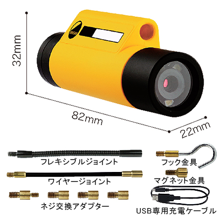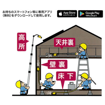 ■特長 ●スマホで見るワイヤレスカメラ。(最長12m) お持ちのスマートフォン等に専用アプリ(無料)をダウンロードして使用します。 ![]() ●録画(音声付※1)、静止画の撮影、確認もスマホで操作 ※1:音声はスマートフォン等のマイク機能を使用して録音されます。画面確認時の音声メモとして便利な機能です。 ●偏芯ロック機構 竿をねじって伸縮をロック・解除できるロックすると竿が固定します。押しても縮まないので電線押込みができる。 ![]() ●LEDライト付で暗所もOK!明るさ調節可能 ●カメラ本体は水がかかってもOK!(IP64) ●USB充電式 ●屋根裏、床下、狭い場所などの点検に ![]() ●映像を遠隔配信できる※3 「Teams」「LINE」「FaceTime」「Google Meet」等アプリを利用し、スマホ画像を「画面共有」することで、遠隔配信が可能です。 ただしWifi接続を当商品に使用しているため、モバイルデータ通信での配信になります。※4 ※3:スマホ・PC の機種や OS のバージョン・設定によりできない場合もございます。 ※4:通信回線の状況により十分に機能しない場合もございます。一つの事例としてご紹介となります。動作保証をするものではありません。あらかじめご了承ください。 ■寸法図と付属品 ![]() ■仕様