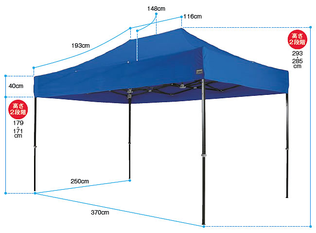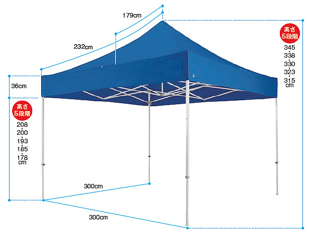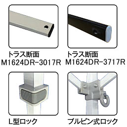 | ■特長 ●わずか1~2分!!簡単設置・撤収 設営は大人2名でゆっくり広げるだけ。パイプの組立作業は無し。初めての使用時以外は設置時間全体で1分。天幕を装着してからの1分ではありません。 ●天幕をつけたままたためる! 設営時も収納時も天幕の着脱や畳んだりの手間がいりません!天幕を付けたままで良い設計で作られています。実は天幕を着脱するなどはございません。 ●天幕を傷つけない設計 テントの開閉時に天幕生地がひっかかたり、食い込んだりしないよう、最適なトラス間隔で設計しました。フレームとの間隔が無いテントは天幕が破れてしまいます。 ●オリジナルプリント可能 学校名団体名などの名入れはもちろん、フルカラーの印刷も可能。全面プリントは昇華転写プリント方式なので、直射日光による日焼けや色あせを防ぐ耐久性の高さが自慢です。 ●テントのカスタマイズ可能 風対策品はもちろん、横幕やフラッグなどのSPツールやオプション品が豊富なのでオリジナルのテントにカスタマイズ可能。イベントなどで注目度アップ間違い無しです。 ●アフターサービスも万全! 末永く使って頂く為に、もしもの時のテント有償修理はもちろん、パーツを注文してご自身で修理可能です。 ![]() ■タイプ M1624DR-3017Rはロック解除もラクラク。ローラーキャリーバッグ付きです。 スライダーのロックは引くだけのプルピン式で、収納時に解除しやすくなっています。テントの高さは5段階に調節可能で、最高345cmとデラックスシリーズ並みの天井高です。 ※米国の難燃性基準CPAI-84に適合しています。 M1624DR-3717Rは強度にこだわった設計。コンパクトに収納できます。 フレーム内部は均等間隔に設けたトラスが梁の役目を果たし、強度をアップしています。 また、テントの高さはワンプッシュで簡単に変えられるL型ロックで、2段階に調節できます。