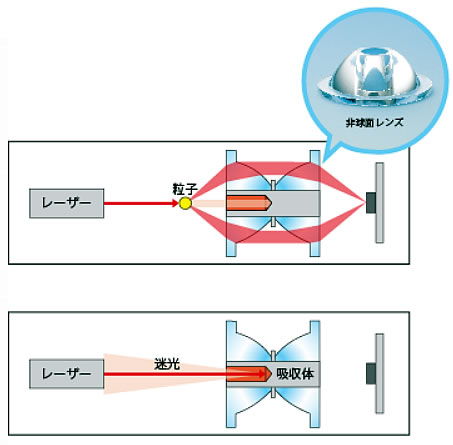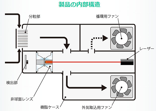 数値でわかる、空気の汚れ![]() ■特長 1. 基本に忠実な設計でありながら低価格を実現。 2. 校正認可機器との高い整合性を実現。 3. 誰でもあつかえる簡単操作。 4. 最短30秒で結果がわかるスピード測定。 5. 2電源(ACアダプタ/乾電池)対応。 6. 測定数値の単位はmg/m3相当。浮遊粉じん量の確認に。 ![]() ■高感度 光散乱集光構造 粒子によりレーザー光は散乱します。 散乱した光を非球面レンズにより集光して受光センサーに効率よく伝達することで大幅に感度が向上します。 ![]() ■迷光対策 粒子が無い場合、レーザー光が直進し吸収体により迷光(ノイズ)を抑える構造となっており受光センサーに余計な光が入らないため低濃度の測定を可能にしました。 ![]() ■校正認可機器との整合性 校正認可機器と遜色のない測定精度です。 確認用として十分に利用することができます。 ![]() ■仕様