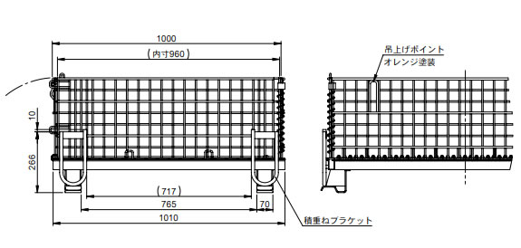 | ■特長 ●たたんだパレットは安定した状態で積み重ねて保管できます。 ●リフトのフォークが楽に入ります。 ●吊上げ式はクレーンも使えます。 ●耐久性に優れたドブメッキ仕上 ●特注サイズも承ります。 ■寸法図 ![]() ![]() ■仕様