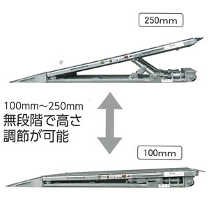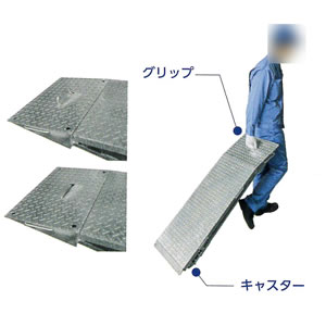| 高さ無段階の自由調節で、現場の段差を解消。 キャスター付きのスロープだから、ラクラク移動 挟まれ防止に安全ストッパー 高さ調節の目安に調節用目盛り 楽に移動できるキャスター付き ![]() ■使用例 ![]() ■おすすめポイント ![]() ![]() ■高さ調節用目盛 ナットを目盛りにあわせて調節すると、高さの目安になります。 ナットをまわして高さを調節 高さは100mm~250mmの無段階調節 ![]() ■キャスター キャスターが付いているからグリップをもって楽々移動 グリップをもって楽々移動 グリップは収納式 使用中は邪魔になりません ![]() ■仕様