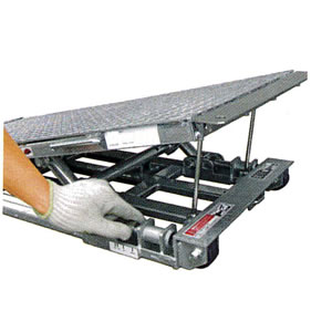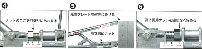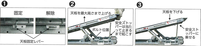 ■ご使用方法 高さ調節は、必ず手順を守って下さい。 ![]() ![]() ①本製品スロープを平らな地面に置いて、天板固定レバーを解除する。 ②天板を最大高さまで上げて、安全ストッパーを起こす ・天板の最大高さは、ボルトが先端側と逆の位置にあることで確認して下さい ・安全ストッパーは、必ず先端側に当たって止まるまで起こして下さい ・安全ストッパーが途中で止まった状態だと、天板が落下する場合があり危険です。 ③天板を下げて、安全ストッパーに乗せる。 ④高さ調節ナットを段差の高さの目盛りにあわせる。 ※1、安全ストッパーを外した時、先端プレートがおおよそ目盛りの高さになります。 ⑤本製品スロープを段差に寄せて、少し天板を持ち上げ安全ストッパーをはずして倒し、段差に先端プレートを確実に乗せ、高さ調節ナットで高さの微調整をする。 ⑥高さ調節ナットは段差側に回して隙間なく締める。 |