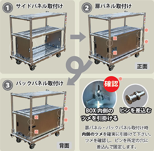■ミニ棚台車用オプション鍵付パネルボックス 大人気のM2226TA-1200Mのオプションとして、簡易セキュリティ機能が付いたパネルボックスが新登場 ●貴重品の保管、材料や工具の収納に最適です。 ●南京錠を取付けられる仕様なので、電動工具などの一時保管に便利です。 ●簡単施工、工具や取付け部材は必要ありません。 ●現場の声を形にしました ![]() ■収納 ![]() ■カギ 市販の南京錠で扉をロック(穴径Φ8mm) ![]() ■取付手順 ![]() ■仕様