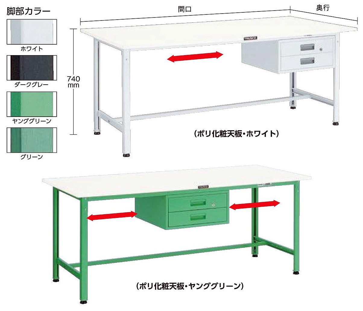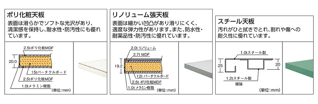 | ●仕分けに便利な2段引出し付です。 ●引出しは使い勝手に応じて使いやすい位置に取り付けできます。 ●引出し内寸:W427×D445×H71mm ●主要部が溶接構造のため、耐久性に優れています。 ●ポリ化粧天板をの表面は、滑らかでソフトな光沢があり清潔感を保持し、耐水性・防汚性にも優れています。 ●リノリューム張天板の表面は、細かい凹凸があり滑りにくく適度な弾力性があり、防水性・耐油性・防汚性に優れています。 ●スチール天板のタイプは汚れがひと拭きで取れ、割れや傷への耐久性に優れています。 ![]() ■天板仕様 ![]() ■タイプ