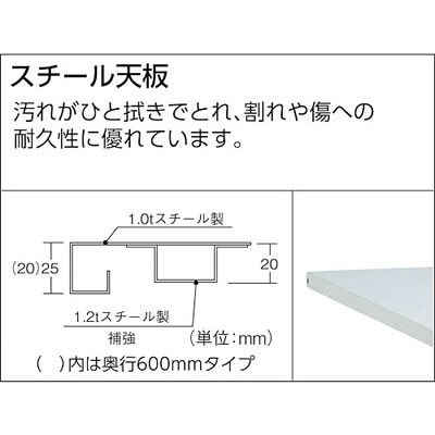 | ■特長 ●下棚2枚付で天板下の空間を有効活用できます。 ●棚板金具を付けると中棚の取り付けも可能です。 ●ポリ化粧天板を使用し、表面は滑らかで、ソフトな光沢があり清潔感を保持し、耐水性・防汚性にも優れています。 ●リノリューム張天板を使用し、表面は細かい凹凸があり滑りにくく適度な弾力性があり防水性・耐油性・防汚性に優れています。 ●スチール天板を使用し、汚れがひと拭きで取れ、割れや傷への耐久性に優れています。 ●均等荷重:400kg ■仕様 ●下棚:AEWLT型 2枚 ●アジャスターねじサイズ:M16×2.0 ■製造国 ●日本 ■注意 ●車上渡しのため、お客様での荷降ろしが必要です。 ■天板 ![]() ![]() ![]() ■寸法図 ![]() ■仕様