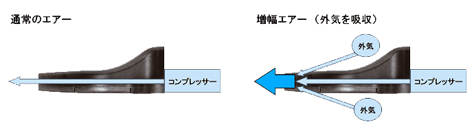 ノズル先端部分で周囲の空気を取り込み、衝突力を増幅させます。