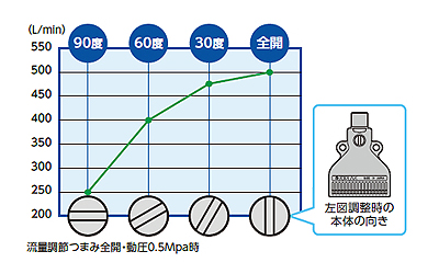 流量調整ネジの角度を変えることで、ノズル単体でも流量の調整が可能です。