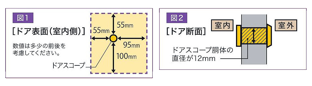 [重要]取り付けについて ※ご購入の前に必ずご確認ください。 ![]() 【M2439HC-100024BN】 1.ドアの厚さが28~58mm以下の一般住宅用玄関ドア。 2.取り外し可能なドアスコープがついており、周囲(室内側)に図1の範囲で突起物が無いこと。 3.室内外ともにドアスコープ付近に取り外せないフタや装飾物がないこと。また、モーションセンサーをドアノッキングケースに格納してドアスコープ外側部に設置する場合は、ノッキングケースのサイズ範囲内に突起物が無いこと。 4.形状が図2のタイプで、各々のサイズ条件を満たすこと。 ※「ドアスコープ」:主に玄関ドアに取り付けてあるのぞき穴。「ドアアイ」と呼ばれる場合もあります。 【M2439AS-200BN】 付属のマグネットウォールマウントを使って取り付ける際は両面テープ(付属)がしっかり接着されているかどうか確認してください。 |