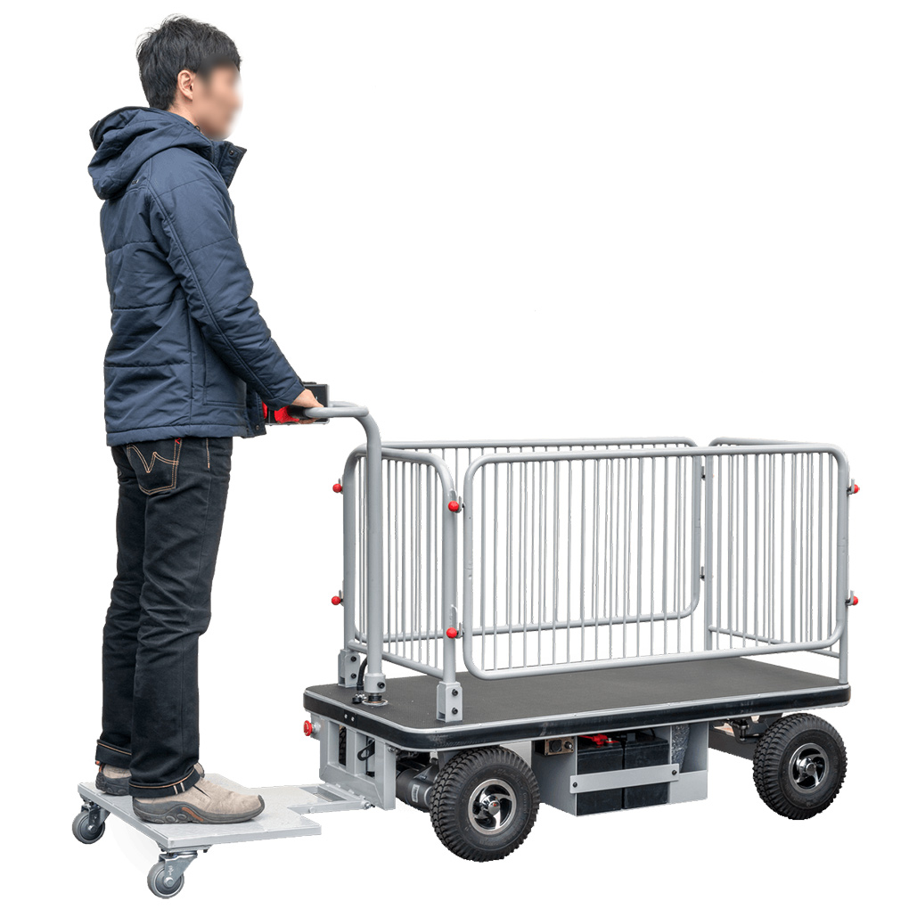 | ●乗れる電動台車 ●作業が圧倒的に楽になる ●前進、後退、操作もラクラク!女性やシニアの方も簡単に使えます。 ●荷崩れ防止の柵は取り外し可能 ![]() ■特長 ●簡単操作!速度調整ラクラク 速度はつまみで調整します。無段階で調整可能なのでお好きな速度で。 前進・後退はスロットルを回すだけ。 ![]() ![]() ●ステップは便利な折りたたみ式 乗って移動する時はステップを下ろして、使用しない時はコンパクトに折りたためます。 ![]() ●充電簡単&バッテリー持続 家庭用電源プラグ(8~10時間の充電)で最大6時間稼働。 ハンドル近くにあるバッテリーインジケーターで残量を確認できます。 充電が切れてしまった際は、足元の電動・手動切り替えレバーを下げると手動で移動可能です ●緊急停止ボタンで安全安心 ハンドル部分、足元に緊急停止ボタンがあり、もしもの時も安心! ![]() ![]() ●柵は取り外し可能 柵の取り付けはとても簡単。荷崩れ防止に役立ちます。 ■使用イメージ ■用途 荷物の運搬・ピッキング作業など ■仕様