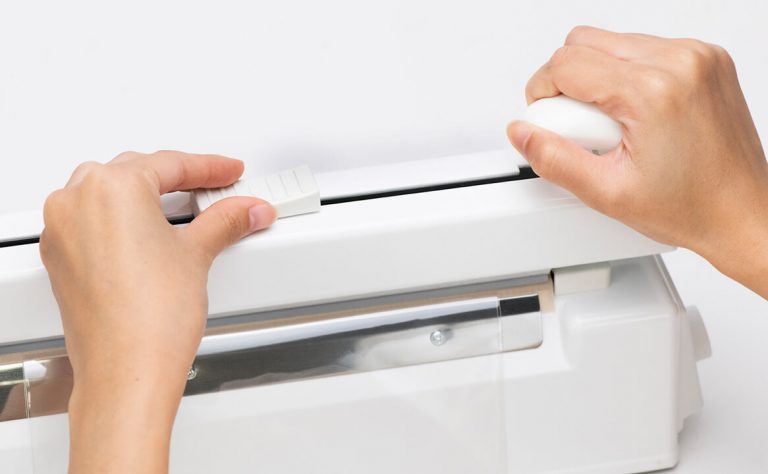 溶着後、付属のカッターをスライドすることで袋の溶着部から約8mmのところをカットすることができます。ロール状のビニールなどを溶着後、カッターで切断する連続作業が可能。カッターを使用せず、溶着のみを行うことも可能です。