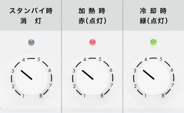 ヒーターの状態によって色が溶着中の加熱時には赤色(点灯)、加熱後の冷却中には緑色(点灯)へと変化するランプを新しく搭載いたしました。※冷却時間は加熱時間に応じて自動的に設定されます。