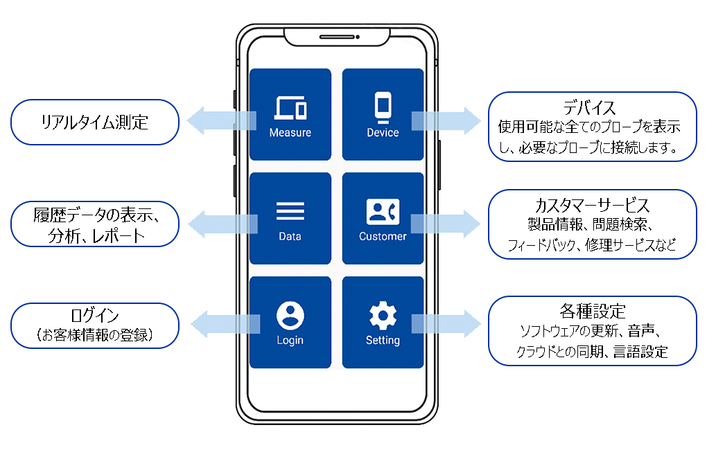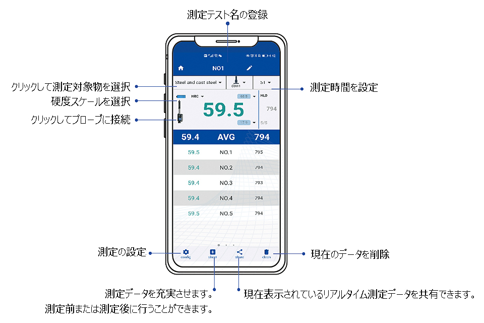 | M2700SP-6481Tはスマホ(現在Android限定)にBluetooth経由で接続することでリーブ硬度を測定できます。 M2700SP-6481Tで測定した硬度値は、専用アプリでリアルタイムでスマートフォンに無線送信できます。 ![]() ■特長 ●M2700SP-6481Tは携帯性に優れ、小型でストラップ付きです。 ●ワイヤレスで充電できる充電式リチウム電池を内蔵しています。 ![]() ●防塵・防水規格IP54 ●衝撃の方向を自動的に特定します。 ●硬度値の上限と下限を事前に設定でき、限界を超えた場合に警報を発するので、バッチテストに便利です。 ●自己定義材料機能により、比較試験により独自の硬度換算表を作成できます。 ●測定記録は、写真、ビデオ、ポジショニングなど、複数の種類の追加情報を追加できます。 ●クラウドストレージ、カスタマイズされたワークシート、リアルタイムのデータ共有、レポート生成など、豊富なポストデータ処理を実現できます。 ●オートオフ機能付 ●M2700SP-6481Tのソフトウェアはリモートでアップグレードできます。 ●スマートフォンをメーカーのインターネットプラットフォームに接続することで、より充実した機能を実現できます。 ■仕様