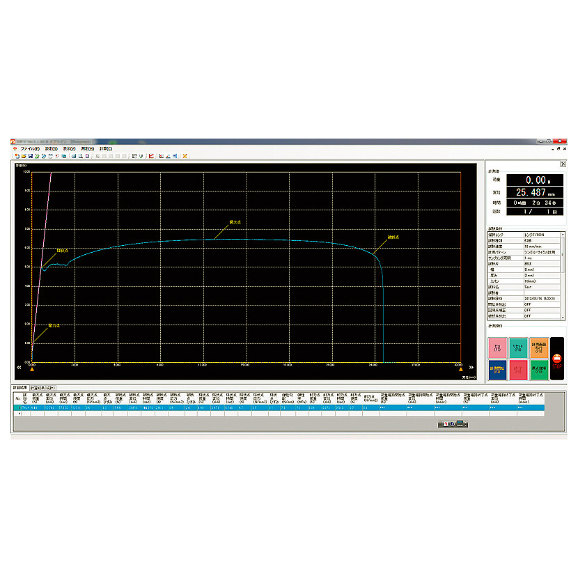 ■オプション ●ソフトウェア <M2749SF-HPVM> 引張圧縮試験機からの荷重及び変位のホールドされた値をCSVテキスト形式で保存できるソフトウェアです。また、自動モードでは1秒以上の間隔ですが連続自動取込が行えます。 ![]() <M2749SF-SPVM> 引張圧縮試験機からの荷重及び変位データをパソコンに取り込み、荷重・変位グラフ(SSカーブ)や荷重・時間を描画して、各種演算処理などを行い、試験結果の印刷やデータ保存などを行えるソフトウェアです。 1.引張・圧縮・曲げ・剥離など各試験に対応します。 2.試験計測中のグラフがリアルタイムに確認できます。 3.試験機の各条件をパソコン側から行え、計測開始や終了など、どちらかでも行えます。また、試験機とは条件設定等が同期されているので、どちらか一方の設定で変更や更新が行えます。 4.同種ワーク試験の重ね合わせたグラフを同一ファイルや別々のファイルに保存するなど、データ管理を様々なパターンで行うことができます。 5.初期登録を行えば、あとは計測するだけで自動で演算処理します。 6.演算処理の結果やグラフデータファイルなどを自動で保存できます。 7.各結果やデータはテキストファイルとして保存することができます。またグラフをBMPに変換できるので、市販の表計算ソフトなどを利用することで、好きな様式やレイアウトに結果出力を行うことができます。 8.計算結果や、統計データなどはグラフが面下に配置してあるため、いつでも確認できます。 また、複数のデータから該当データの項目をクリックすると、画面に結果を表示させることができます。 ![]() <M2749SF-SPVM-EX> データ処理ソフト「M2749SF-SPVM」と併せてのご使用により、専用制御機能を拡張できるソフトウェアがあります。 ※各種オプションソフトウェアは、データ処理ソフト「M2749SF-SPVM」が必要です。 ※必要な拡張ソフトをご指示ください。 ●荷重維持機能ソフトウェア 維持したい荷重値を設定することにより、常に設定範囲を維持するように試験機を制御動作させながら計測する際に使用していただくソフトウェア。 ●荷重速度追従機能ソフトウェア 通常の引張圧縮試験機における荷重を加えていく速度(試験速度)は○○mm/minというように時間あたりの変位量で行いますが、試験規定によって、時間あたりの荷重の変化量(例:N/min)で試験を行う内容があります。荷重をmm/minという一定速度で加えていくのとは異なり、荷重速度機能は、絶えず変化する荷重値をフィードバックさせながら時間あたりの荷重変化量を一定にするようにする機能となります。 ●F-S(スイッチフィーリング)試験用ソフトウェア スイッチフィーリング試験専用のオプション機能です。 専用の設定項目でヒステリスの各ピーク値、ボトム値を計測することができます。又、回数設定を行うことで繰り返し試験も行えます。 ●プログラム運転ソフトウェア 複数の指定した荷重(又は変位)の値をステップ毎に動作させて計測する機能です。又、制御の種類に荷重維持もあり、組み合わせて設定したプログラムの動作が可能です。 ステップはプラス側マイナス側(荷重指定でマイナス荷重がない場合は行えません)で設定できます。各ステップごとのデータの取込も結果として表示、テキスト出力が行えます。 最大99ステップまで登録が可能です。 ■仕様