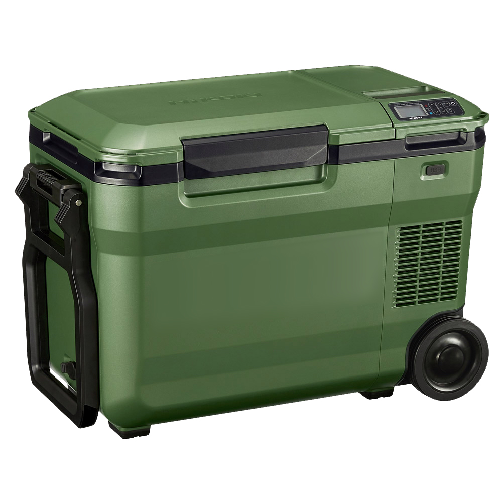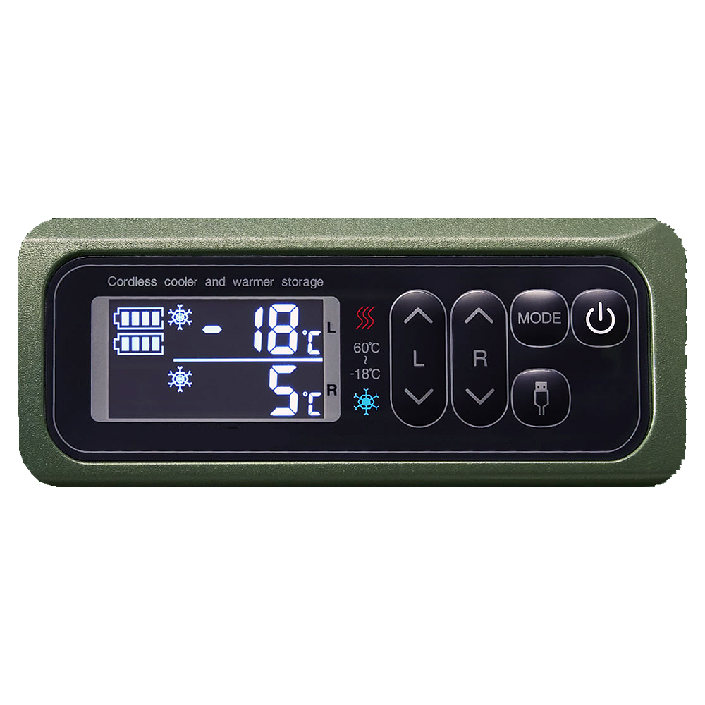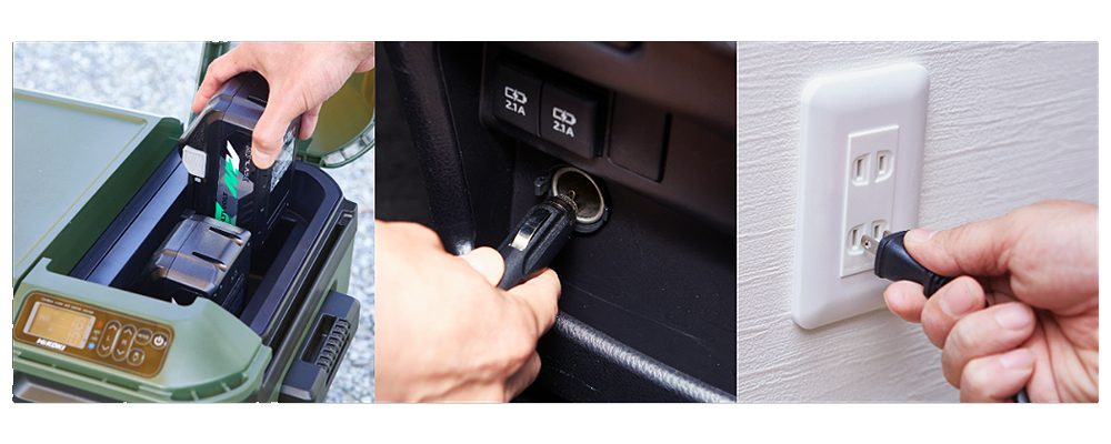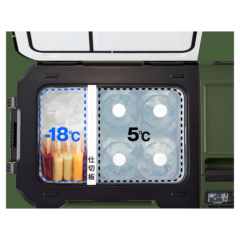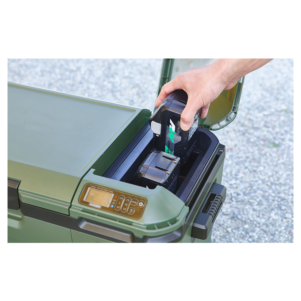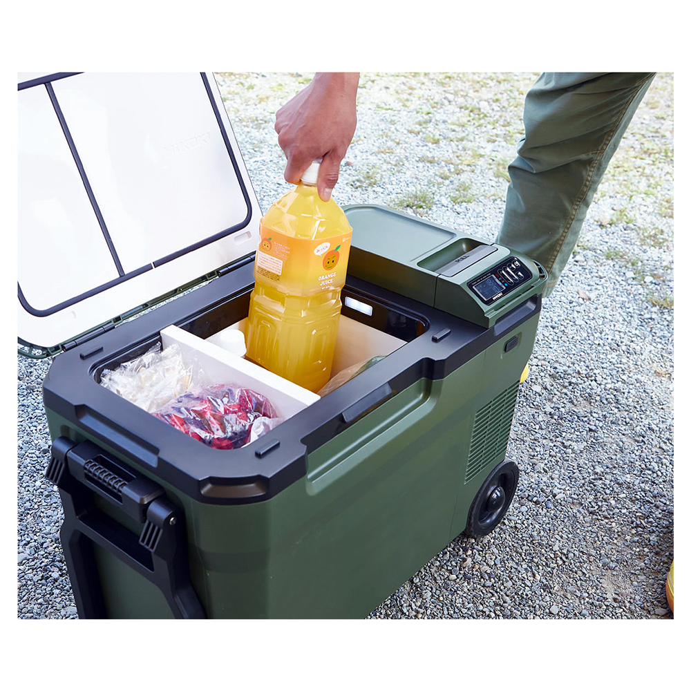 ■特長 ●冷蔵と冷凍が同時にできる2部屋モードを搭載 付属の仕切板で庫内を2部屋にセパレート。左右で異なる温度を用途に応じて設定できます。-18℃、および-15℃~60℃の17段階で温度設定が可能です。 (2部屋設定では、温度差が30℃を超える設定はできません。) ![]() ![]() ●25Lの大容量 標準的な2Lペットボトルを立てた状態で6本、500mLペットボトルを立てた状態で15本収納できます。 ![]() ●蓄電池2個装着で最大18.5時間の長時間使用が可能 蓄電池を2個装着の場合、5℃の保冷時で最大約18.5時間の長時間連続運転が可能。 もちろん、蓄電池1個での使用も可能です。 ![]() ●大型キャスターとハンドルで移動もラクラク 5インチのゴム製大型キャスターで、ちょっとした段差もラクに越えられます。 さらに、積み込みや階段移動に便利な取手付き。 ![]() ●蓄電池、車のシガーソケット、家庭用電源の3電源に対応 ![]() ●保冷・保温しながらでも蓄電池の充電が可能 家庭用電源や車のアクセサリーソケット(シガーソケット)と本体を接続して、蓄電池の充電ができます。また、保冷、保温しながらでも、蓄電池の充電が可能です。 ●生活防水仕様 防水保護等級IPX4で突然の雨でも安心です。(小雨の内に屋内へ移動させてください) ●庫内の水抜きに便利なドレンコック付 庫内を水洗い後、本体を逆さにする必要がありません。 ●暗い場所でも庫内が見やすいLEDライト付 両側2箇所に配置。フタを開けると自動点灯します。 ●スマートフォンの充電に/USB端子付 蓄電池から充電できます。(コードは市販品をご使用ください。) ■仕様
